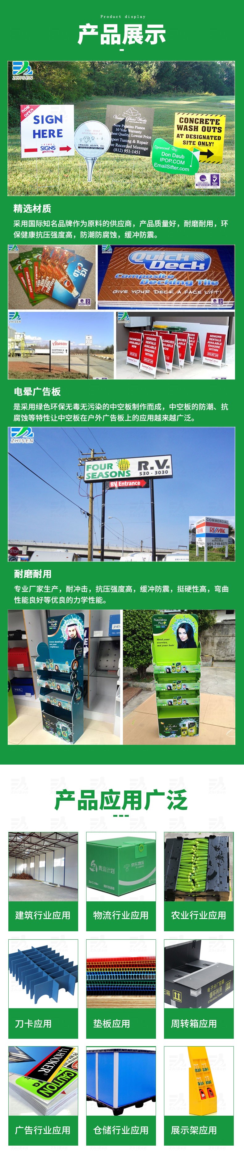 產品簡介:抗UV中空板是采用現代化工HDPE和HDPP材料,是一種重量輕(空心結構)、無毒、無污染、防水、防震、抗老化、耐腐蝕、顏色豐富的新型材料,相比于紙板結構產品,中空板具有防潮、抗腐蝕、更輕便等優勢來代替紙板。 板材表面印字、噴畫、貼畫等后加工制作出各類環保產品;